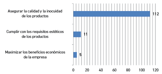 La Figura 3 muestra las respuestas sobre el propósito de las BPM en restaurantes y revela que un 88,89 % de los encuestados prioriza la calidad e inocuidad de los productos, lo que destaca una fuerte conciencia sobre la importancia de la seguridad alimentaria en el sector. En comparación, solo un 8,73 % enfatizó en los aspectos estéticos y un 2,38 % se centró en los beneficios económicos directos. Esto refleja un sector enfocado en la salud pública y la calidad del servicio, aunque la baja priorización de los aspectos económicos indica una oportunidad para educar sobre cómo las BPM pueden optimizar operaciones y reducir costos. Este contexto es ideal para introducir metodologías como lean manufacturing y six sigma, que podrían integrar la eficiencia operativa con los altos estándares de calidad e inocuidad ya existentes, que impulsen un enfoque de mejora continua.