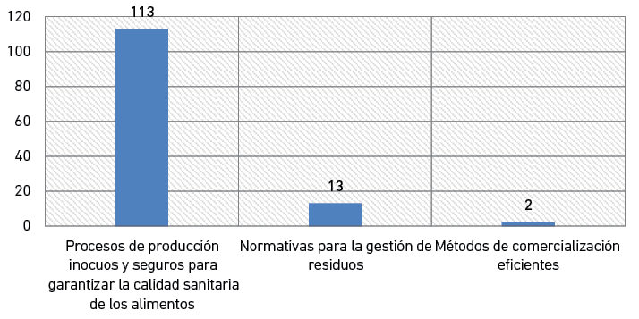 La Figura 5 revela que el 89 % de las respuestas se enfocan en procesos de producción inocuos y seguros, lo cual refleja una alta prioridad en la calidad sanitaria de los alimentos. No obstante, este enfoque es limitado, ya que solo el 10,2 % de los encuestados considera importantes las normativas de gestión de residuos y apenas un 0,8 % menciona métodos de comercialización eficientes. Esto subraya la necesidad urgente de mejorar la formación en BPM para abarcar aspectos como la gestión ambiental y técnicas de conservación. Implementar programas de capacitación que cubran estos temas fortalecería la implementación integral de las BPM y las alinearía con los estándares de la industria y las expectativas regulatorias. Por lo tanto, se optimizarían la seguridad alimentaria, la calidad del servicio y la eficiencia en el uso de recursos, así como se reduciría el impacto ambiental.