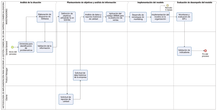 Se monitorearon y evaluaron los KPI a través de indicadores propuestos, como las ventas promedio mensuales y la rotación de inventario. La validación de los indicadores se realizó con la gerente general y los resultados se utilizaron para ajustar las estrategias y asegurar la mejora continua en la gestión comercial. En la Figura 4 se presenta el proceso descriptivo de la metodología propuesta, se señalan las acciones clave por etapa y los autores que la ejecutaron.