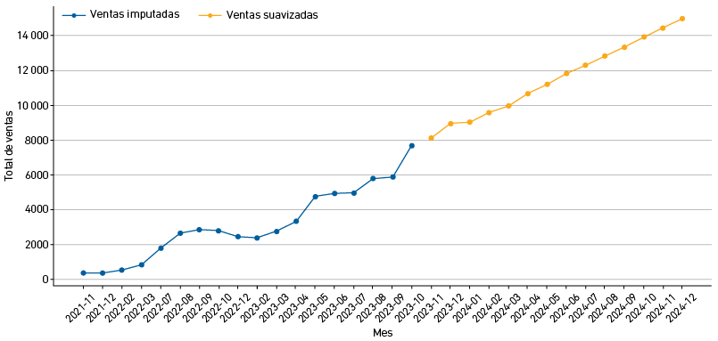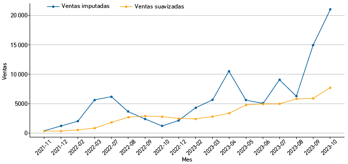 En el análisis de las ventas históricas, se observó que no hay una tendencia alcista clara en las ventas mensuales. Esta observación inicial llevó a considerar técnicas para suavizar la serie temporal y facilitar la identificación de tendencias subyacentes (Talkhi et al., 2024). Se aplicó la técnica de suavización exponencial simple a las ventas mensuales para destacar posibles tendencias a largo plazo. La gráfica resultante (véase la Figura 6) muestra que la serie temporal suavizada presenta una tendencia alcista, en contraste con la serie original.