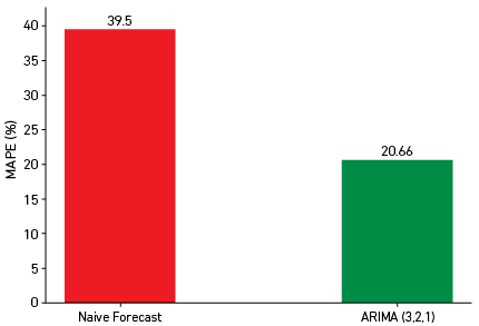 Para modelar y predecir ventas futuras, se seleccionó el modelo arima (3, 2, 1)1 basado en el criterio de información de Akaike (Talkhi et al., 2024). Mediante una comparación señalada en la Figura 7, con un modelo naive, arima mostró menor error absoluto medio porcentual (mape) y reveló una mayor precisión en las predicciones (Talkhi et al., 2024).