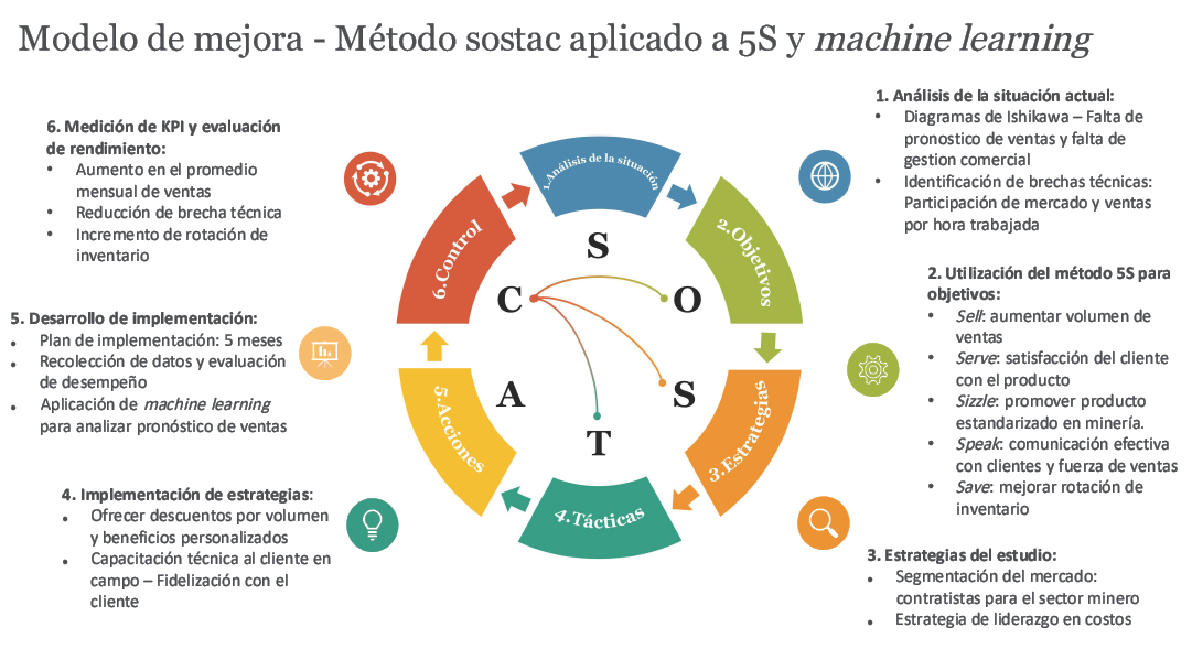 El objetivo general de la investigación es la implementación de sostac, 5S y machine learning para mejorar la gestión comercial en una empresa de servicios, de tal forma que se logren resultados positivos a través de los indicadores planteados —previa investigación— y con una meta de mejora para un periodo de cinco meses. Las herramientas utilizadas en la investigación tienen el propósito de lograr una mejora significativa en la eficiencia operativa y una mayor competitividad en el mercado, mediante una metodología de gestión comercial óptima. Este trabajo no solo beneficiará al objeto en estudio, sino que también es replicable en cualquier artículo del catálogo de la organización; además, proporcionará un marco replicable para que las empresas del sector puedan lograr un crecimiento sostenible. Teniendo en consideración lo destacado, se formula la siguiente pregunta de investigación: ¿cómo la implementación de las metodologías sostac, 5S y machine learning puede mejorar la gestión comercial en una empresa comercial del sector de servicios?