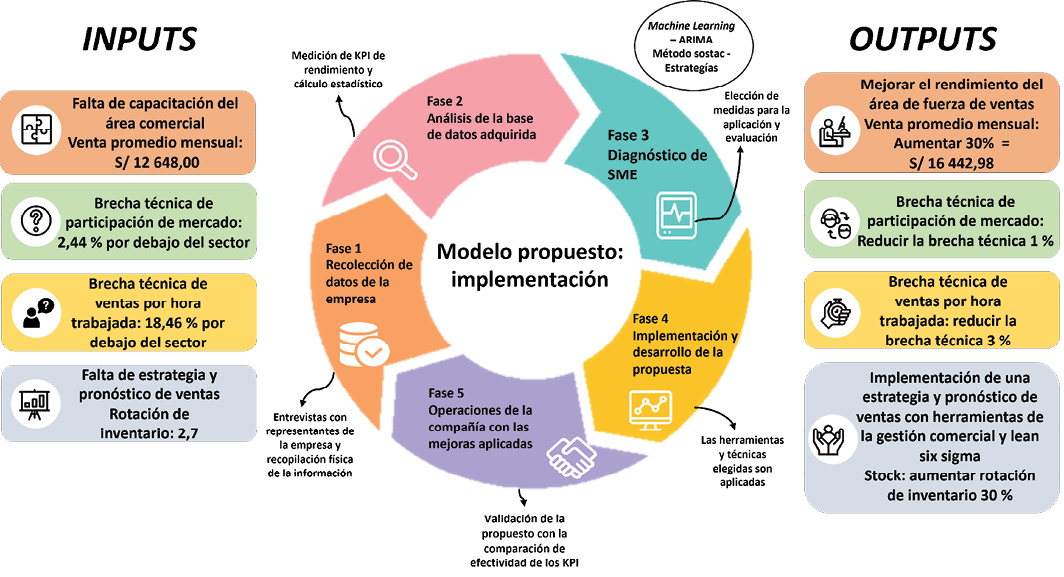 ABSTRACT. The following study addresses the issues of commercial management and the lack of sales forecasting in a company that sells personal protective equipment. Therefore, the study aims to implement an improvement model in the commercial management of a service sector company using the SOSTAC method, integrating 5S and machine learning with ARIMA. The research is applied, quantitative, and descriptive. SOSTAC and 5S, as marketing and engineering tools, contributed to order, management, and control in the implementation process of the model in the organization for profitable commercial management. On the other hand, machine learning provided an accurate diagnosis of future demand by implementing the ARIMA code. The sample consisted of sales data from January 2020 to October 2023. A situational diagnosis, internal and external analysis, identification of key processes, and the implementation of strategies for improving commercial management were carried out. The results indicated an improvement in the average monthly sales from S/ 12 648 to S/ 20 109,19, an increase in market share from 9,75 % to 10,81 %, a reduction in the efficiency gap of the company compared to the sector from 18,46 % to 13,60 %, and an improvement in inventory turnover from 2,7 to 3,62. It is concluded that the implementation of the proposed model, with the use of 5S and machine learning with ARIMA, significantly improves efficiency, sales volume, market share, and commercial profitability, favoring the growth and sustainability of the company.