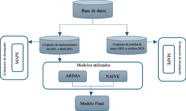 El modelo arima se utilizó para predecir las ventas futuras, lo que permite un análisis preciso de series temporales (Talkhi et al., 2024). Se selección el modelo arima (p, d, q) con base en el criterio de información de Akaike, y se comparó con un modelo naive, mostrando una mayor precisión en las predicciones. En la Figura 3 se muestran los puntos críticos para la evaluación del modelo final y el proceso por el cual pasaron los modelos prospectados, tanto arima como naive.