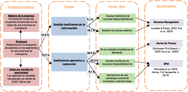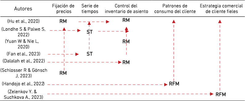 Para mantener una alta rentabilidad y competitividad, la gestión eficiente de recursos y las estrategias de revenue management (RM) son cruciales. Guerriero et al. (2021) señalan que las estrategias de RM buscan vender el producto adecuado al cliente adecuado, optimizando ventas mediante overbooking, previsión de demanda, fijación de precios y control de inventario de asientos (p. 238). Fan et al. (2023) afirman que la demanda afecta la gestión de ingresos, ya que influye en los límites de reserva. Los modelos tradicionales de pronóstico utilizan la regresión lineal y el suavizado exponencial, entre otros enfoques, y los ajustan según características estacionales (p. 15). Además, maximizar la eficiencia y rentabilidad requiere de decisiones estratégicas basadas en el análisis de la demanda, el comportamiento del consumidor, los precios de la competencia, etcétera (Dalalah et al., 2022, p. 519). La segmentación de clientes permite ofrecer servicios ajustados a sus preferencias y diseñar estrategias específicas para cada grupo (Zelenkov & Suchkova, 2023). El modelo recencia-frecuencia-monto (RFM) es un método efectivo y simple para la segmentación de mercado, aplicado en distintos rubros y modalidades de compra (Handojo et al., 2023). Un análisis RFM permite identificar segmentos y definir la propuesta de valor e inversión para cada segmento (Brandizzi et al., 2022). En Washington se desarrolló un modelo RFM, el cual mejoró la segmentación y aumentó su margen en 1,2 % para dicho año (Wilbert et al., 2023).