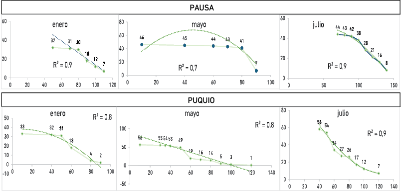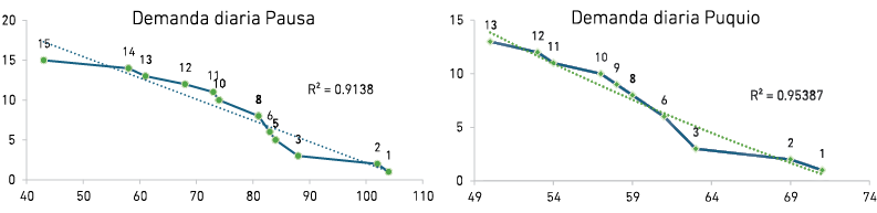 Para la herramienta, se utilizaron fórmulas que definen la variable dependiente (la demanda) sobre la base de la variable independiente (el precio), las cuales tienen que cumplir con un coeficiente de determinación (R2) por encima de 0,7 para demostrar una buena relación entre variables. El diagrama de dispersión de precios se presenta en la Figura 4.