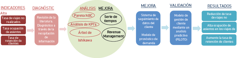 Finalmente, los resultados muestran que la propuesta de mejora del proyecto es significativa y positiva para la empresa, debido a que la simulación numérica valida el rendimiento de incrementar la tasa de ocupación de asientos en 6,99 %, frente a una brecha técnica de 5,85 %. En términos de implementación, maximizar las ganancias basadas en la demanda presenta una efectividad de entre 1,2 % y 25,6 %.