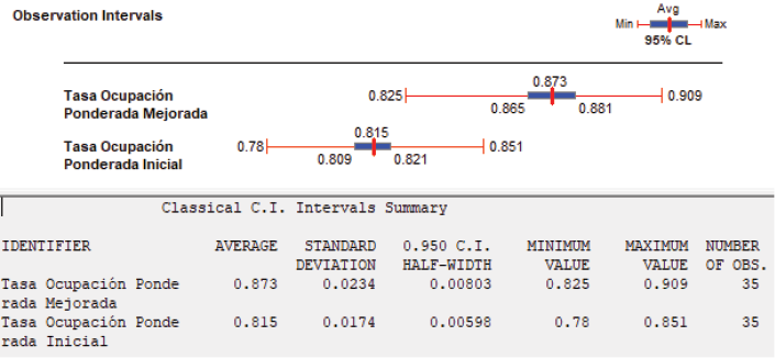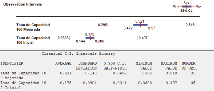Se realizaron pruebas con diversos valores de réplicas, para lo cual se empleó el método empírico basado en la tasa de capacidad. Los resultados concluyeron que, a mayor número de réplicas, menor era el error (half-width). Finalmente, con treinta y cinco réplicas se obtuvo un half-width cercano a 0,05, el cual a su vez cumplía con la segunda condición (standard deviation mayor a half-width).