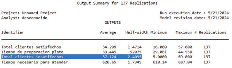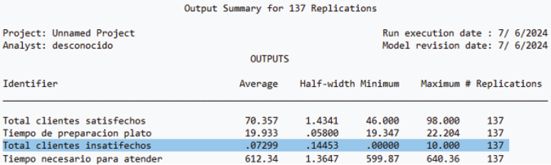 Para determinar el número óptimo de réplicas en la simulación y utilizando la fórmula especificada en la metodología, se emplearon los siguientes datos en la fórmula previamente mencionada: 120 ejecuciones iniciales (n = 120), el half-width obtenido (h₀ = 2,6635) y el half-width deseado (e = 2,4909) (Rossetti, 2021). La fórmula indicó que el número óptimo de réplicas es 137.