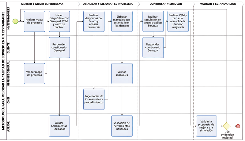 La metodología se organiza en cuatro etapas según el enfoque de six sigma, que emplea el modelo DMAIC (definir, medir, analizar, mejorar, controlar) (Macías Cevallos & Naranjo Vargas, 2021). La primera etapa se centra en el diagnóstico y la medición del problema. La segunda etapa se dedica al análisis del problema y a la mejora de la calidad del servicio y del proceso de atención al cliente. La tercera etapa se enfoca en controlar las mejoras implementadas y en realizar la simulación con el software Arena y la herramienta “Input Analyzer”. Finalmente, la cuarta etapa se orienta hacia la validación de la solución propuesta y la simulación. La Figura 1 ilustra la metodología y las herramientas empleadas en cada una de las fases del modelo DMAIC mediante el software Bizagi.