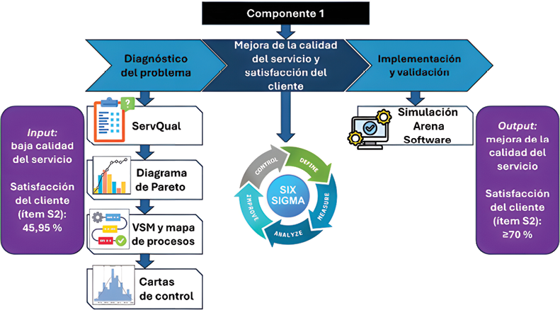 En el modelo macro se detallan con precisión los elementos de entrada y salida, los cuales representan el desafío al que se enfrenta la empresa y el resultado esperado tras la implementación de la solución. El elemento de entrada del modelo es el problema de la baja calidad del servicio, mientras que el elemento de salida es el aumento de dicha calidad, con el objetivo de alcanzar al menos un 70 % de satisfacción del cliente, tal como lo establecen Chen y Chen (2015). Asimismo, se describen las herramientas utilizadas para diagnosticar y definir el problema, entre las cuales se incluyen el modelo Servqual, el diagrama de Pareto, la herramienta value stream mapping, un mapa de procesos y una carta de control. El componente 1 del modelo consiste en la aplicación de six sigma, siguiendo la metodología DMAIC. Finalmente, se lleva a cabo la simulación en el software Arena.