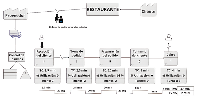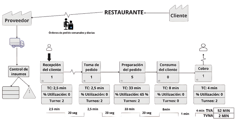 La herramienta VSM permite analizar los recursos, la utilización y los turnos del personal en cada etapa del proceso operativo de una empresa (Porras et al., 2023). En la Figura 4, que muestra el VSM actual de la empresa, se observa que el proceso de recepción y toma de pedidos tiene un tiempo de ciclo (TC) de 2,5 minutos, con una utilización del 0 %, y se realiza con un mozo en dos turnos. La preparación del pedido, con un TC de 33 minutos y una utilización del 65 %, es realizada por cinco cocineros en dos turnos. El consumo tiene un TC de treinta minutos. El cobro, con un TC de cuatro minutos y sin utilización, lo maneja el personal de atención al cliente. El tiempo total de valor agregado (TVA) es de 52 minutos y el de no valor agregado (TVNA) es de dos minutos, lo que señala oportunidades para mejorar la eficiencia.