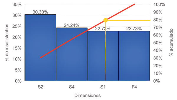 Al analizar el cuestionario Servqual, se observa que los cuatro ítems con mayor porcentaje de clientes insatisfechos corresponden a tres ítems de la dimensión de sensibilidad (S1: 40,54 %, S2: 54,05 % y S4: 43,24 %) y uno de la dimensión de fiabilidad (F4: 40,54 %). Con base en estos datos, se utilizó un diagrama de Pareto para identificar las causas prioritarias a ser abordadas para mejorar la calidad del servicio. La Figura 5, que presenta el diagrama de Pareto, muestra que el ítem S2 tiene el mayor porcentaje de clientes insatisfechos. De acuerdo con el principio de Pareto 80/20, se determinó que se deben priorizar tres ítems principales, todos pertenecientes a la dimensión de sensibilidad, ya que representan aproximadamente el 80 % de las causas que contribuyen al problema (Zhu, 2022).