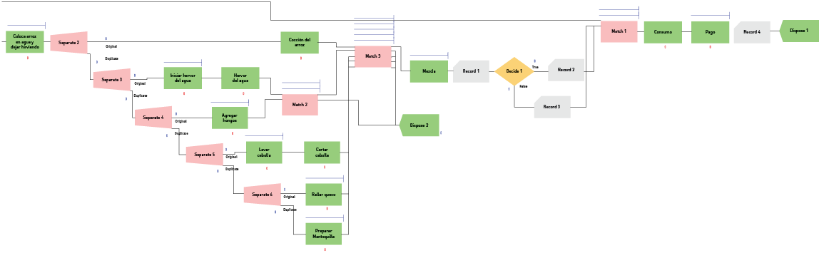 Al introducir los datos del estudio de tiempos realizado en el restaurante en el software Arena (herramienta “Input Analyzer”), no se obtuvo evidencia estadística para rechazar la hipótesis propuesta acerca de la distribución que mejor modela el conjunto de datos. En la Tabla 1 se presentan las distribuciones estadísticas que fueron validadas y posteriormente ingresadas en el software Arena. Empleando las distribuciones estadísticas mencionadas, se desarrolló un modelo en el software Arena que refleja la situación actual de la empresa. La Figura 6 muestra este modelo.