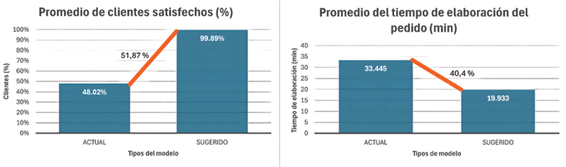 Promedio de clientes satisfechos y tiempo de elaboración del pedido (modelo actual versus sugerido)