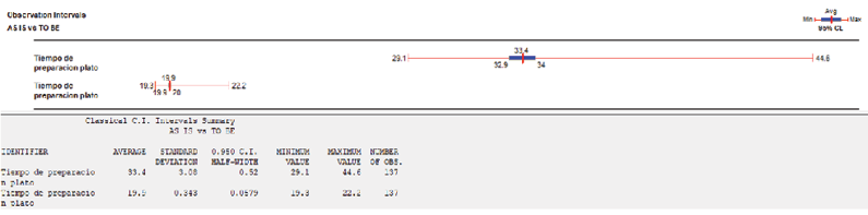 La Figura 10 demuestra la existencia de una diferencia estadísticamente significativa al comparar los intervalos de confianza entre el escenario actual y el sugerido. En el escenario propuesto, el tiempo de elaboración del pedido es menor, con un intervalo comprendido entre 19,9 y 20 minutos, mientras que en el modelo actual, dicho intervalo se sitúa entre 32,9 y 34 minutos.
