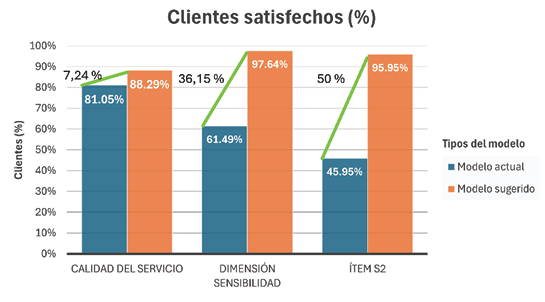 Porcentaje de clientes satisfechos en el ítem S2, la dimensión sensibilidad y en la calidad del servicio general (modelo actual versus modelo sugerido)