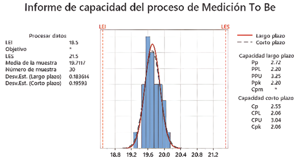 La Figura 11 muestra que el modelo sugerido incrementa significativamente el porcentaje de clientes satisfechos en un 50 % en el ítem S2, un 36,15 % en la dimensión de sensibilidad y un 7,24 % en la calidad del servicio, en comparación con el modelo actual. La carta de control ilustrada en la Figura 12 muestra los resultados obtenidos tras estandarizar los procedimientos. El nuevo índice Cp es 2,55 y el Cpk es 2,06, basados en treinta observaciones de la simulación realizada en el software Arena. Esto indica una capacidad excepcional del proceso de preparación de pedidos, ajustado rigurosamente a los límites de especificación. La variabilidad en el tiempo de elaboración es mínima, lo que garantiza un control efectivo del proceso. Los índices Cp y Cpk superiores a 1,33 reflejan un resultado favorable (Portuondo-Paisan et al., 2023).