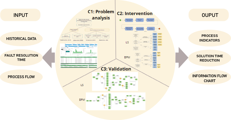 Se analizaron indicadores clave de desempeño para evaluar los tiempos actuales de respuesta y resolución de la empresa para diferentes tipos de fallas. Asimismo, se utilizaron las herramientas LS y BPM para mejorar el proceso: visualizar el flujo actual, la etapa en la que se encuentra el cuello de botella e identificar las actividades cuya duración podría estar siendo parte del problema.