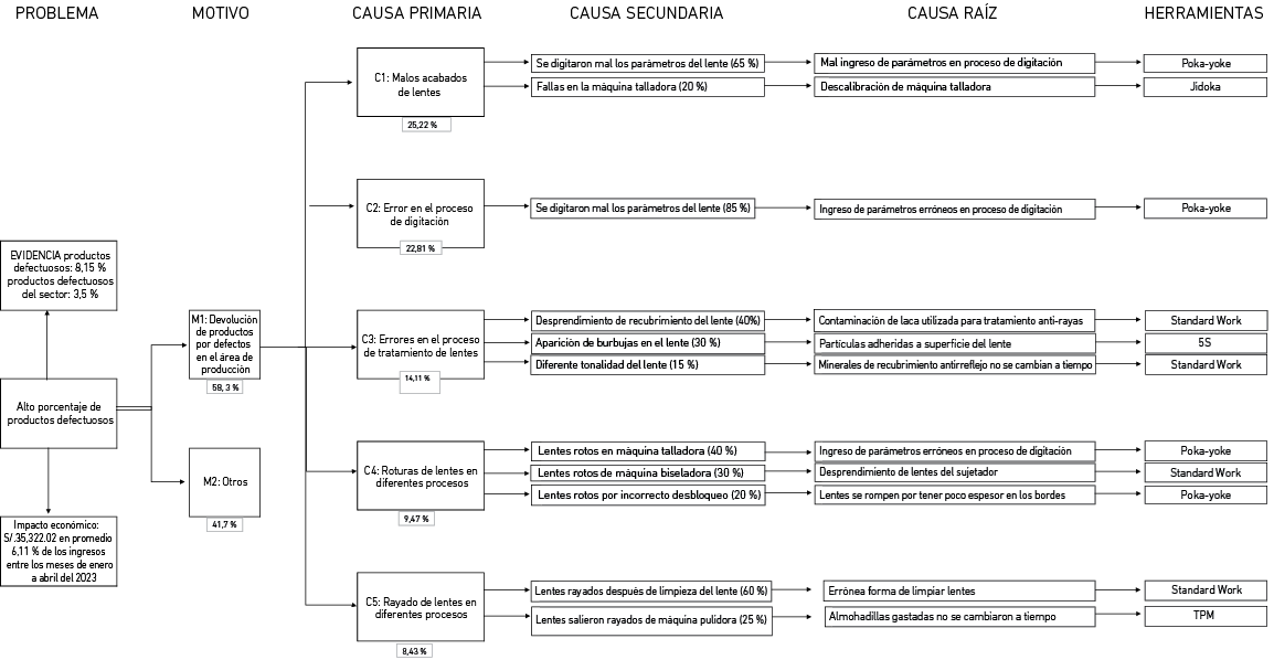 En la obtención de información se evidenció la problemática principal mediante datos cuantitativos proporcionados por la empresa en estudio. Se identificaron los principales problemas a ser solucionados con las herramientas de lean manufacturing correspondientes. En la Figura 2 se puede observar la problemática, el motivo, la causa primaria y, sobre todo, la causa raíz.