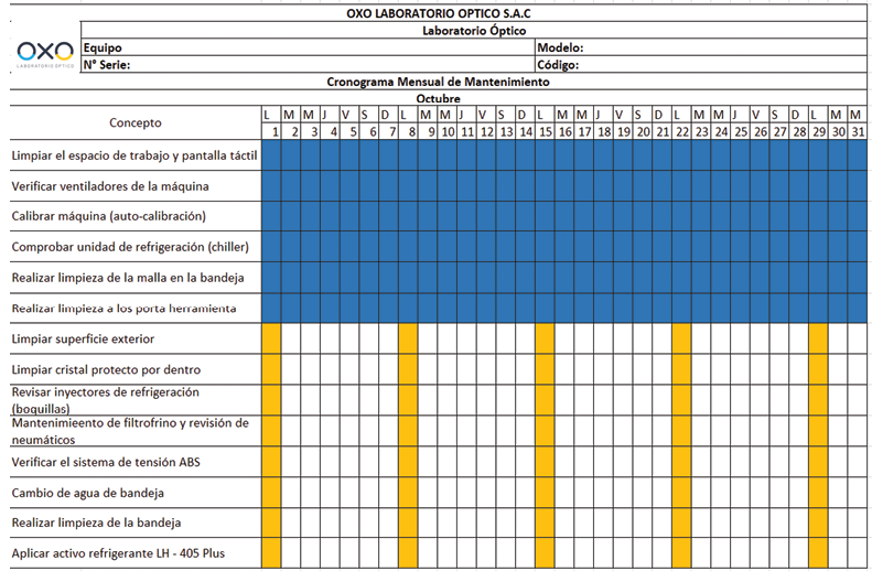 Por otro lado, se recopiló información sobre el plan de mantenimiento que se realiza actualmente para la máquina de tallado. Este se divide en mantenimiento por cantidad de cortes (de lo que sí se llevaba un correcto control) y mantenimiento por tiempo de uso. Con esta información, se realizó un nuevo formato para el registro y cumplimiento del cronograma de mantenimiento.