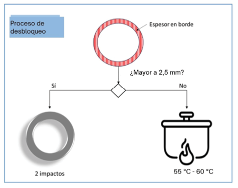 Luego, se determinó que el parámetro asociado a las roturas de lentes en este proceso está vinculado con el espesor en los bordes, el cual debe tener un valor mínimo de 2,5 mm para que no se rompa en el momento de ser desbloqueado. Asimismo, no se puede emplear un medidor de espesor, ya que no todos los lentes poseen el diámetro adecuado que deje los bordes por fuera de la chapa. Por ello, se puede visualizar el espesor que obtuvo el lente recién al finalizar la actividad de pulido en la máquina. Ya conociéndose el espesor obtenido por el lente en los bordes, se puede tomar una decisión para la forma de desbloquear el lente.