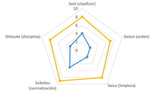 Se observa una mejoría en cada una de las 5S con respecto a la evaluación inicial realizada. Para verlo con mayor claridad, en el siguiente diagrama se presenta una comparación entre las dos evaluaciones realizadas.