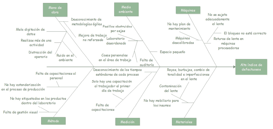 Para concluir con el análisis de las causas raíz, también se realizó un diagrama de Ishikawa, con el cual se tuvo un panorama más claro de los problemas que generan defectuosos en la elaboración de un lente. Se evidenció la falta de un trabajo estandarizado, dado que existe un desconocimiento de metodologías de mejora, falta de capacitaciones y auditorías. Nunca se había empleado la metodología 5S para tener un mejor orden en el área de trabajo, lo que afecta directamente al proceso de producción.