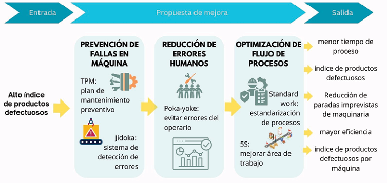 Del presente trabajo de investigación se concluye que, gracias a los métodos aplicados en la propuesta de mejora, se obtuvo una disminución de defectuosos de 8,22 % a 1,4 %. Con ello, se valida la propuesta de mejora para futuras implementaciones.