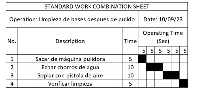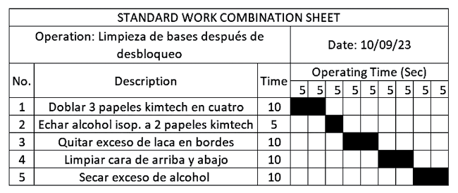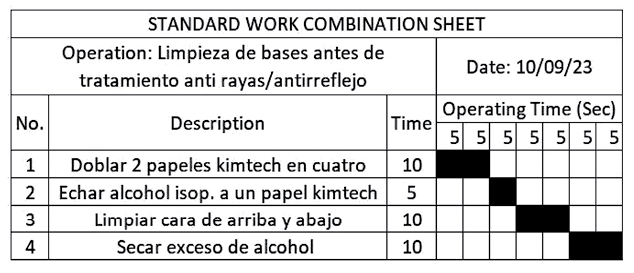 En este caso, se implementó la herramienta standard work. Se identificó que las limpiezas manuales que se realizan antes de ingresar las bases a las actividades de tratamiento antirrayas y antirreflejo requerían de estandarización. También, se realiza una limpieza después del pulido y del desbloqueo.