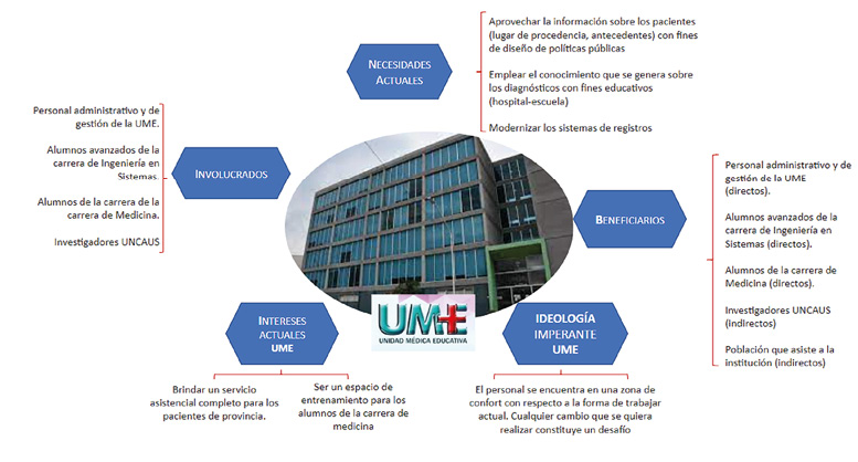 Cumplir con el propósito de reestructurar la información con la que se cuenta y obtener datos de utilidad con fines administrativos y de enseñanza, implica reestructurar también los circuitos de trabajo existentes y encontrar un mecanismo correcto para la representación y la manipulación de la información. A su vez, se considera la posibilidad de emplear técnicas de inteligencia artificial (IA) bajo un marco de uso ético y moral, especialmente para obtener sistemas de entrenamiento para los profesionales médicos en formación. Así es que en este trabajo se presenta un proyecto de reestructuración sistémica para la UME, que abarca aspectos organizacionales y técnicos. Se tomarán en cuenta algunas etapas de la metodología de los sistemas blandos (MSB) (Checkland & Haynes, 1994; Kish et al., 2016; Torlak & Müceldili, 2014), así como también el rediseño de una organización que soporte los cambios propuestos, atendiendo principalmente a su idiosincrasia y valores (Schvarstein, 1998).