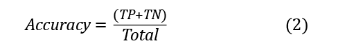 La métrica accuracy(2) puede ser obtenida de la matriz de confusión en la Tabla 3. TN son los valores que fueron negativos en la predicción y también fueron negativos en los valores reales. TP son los valores que fueron positivos en la predicción y también fueron positivos en los valores reales. FN son los valores que fueron negativos en la predicción y no fueron negativos en los valores reales. Y FP son los valores que fueron positivos en la predicción y no fueron positivos en los valores reales.