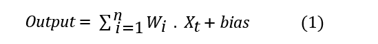 En (1), output es la salida de la neurona, y la función de activación (reLU, sigmoide, tanh) incorpora la no linealidad al modelo. La suma de los pesos es el producto de los valores de entrada y los productos de los pesos correspondientes. Además, la suma ponderada incluye un término constante llamado sesgo.