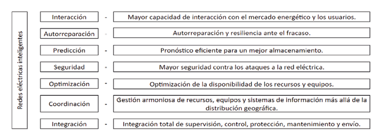 Según Dileep (2020), el término redes inteligentes se refiere comúnmente a las alteraciones tecnológicas y comerciales de los sistemas eléctricos modernos y engloba todo lo que está integrado con ellas, lo que utiliza los servicios de la red y lo que interactúa con ella. Por otro lado, Muthamizh Selvam et al. (2016), las definen como un complejo sistema de subsistemas tecnológicos de comercialización de electricidad y de servicios articulados con los sectores empresarial, legislativo, político y social. En el aspecto técnico, las redes inteligentes incluyen las redes de transmisión y distribución, las instalaciones de producción, consumo y almacenamiento, así como los sistemas relacionados de toma de decisiones operativas y de inversión. También tienen fuertes conexiones con otras fuentes de energía, dominios a través del acoplamiento de sectores y la electrificación de dominios energéticos como la calefacción y refrigeración de edificios, el transporte y los procesos industriales (Yapa et al., 2021). Las redes inteligentes permiten la integración de tecnologías de generación de energía renovable a la red de transmisión, lo que posibilita un acceso eficiente y fiable a la energía con la integración de tecnologías informáticas y de comunicación digital (Mollah et al., 2021). La implantación de redes inteligentes viene motivada por la realidad en la que están inmersas las empresas de servicios públicos, junto con valores intrínsecos como la cultura empresarial, la madurez tecnológica y de procesos, el mercado actual, así como el escenario socioeconómico y medioambiental de su zona de concesión (Liu et al., 2022).