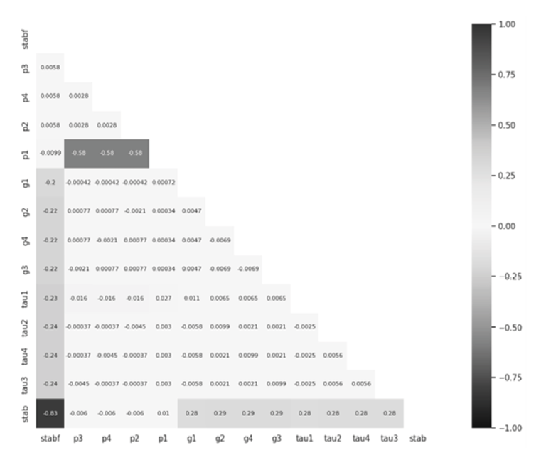Antes de construir el modelo, se verificó la correlación entre cada característica numérica y la variable dependiente (“stabf”), así como la correlación entre las características numéricas que conducen a una posible colinealidad no deseada. La Figura 3 presenta un mapa de calor que ofrece una visión general de la correlación entre la variable dependiente y las doce características numéricas. La correlación entre p1 y sus componentes p2, p3 y p4 está por encima de la media, pero no es tan alta como para justificar su eliminación.