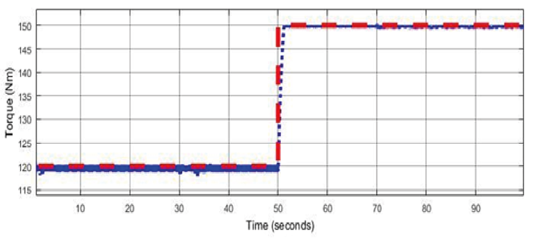 Torque reference (red signal) contrasting with torque signal (blue signal) in the simulink environment for 3000 RPM with positive step in the reference