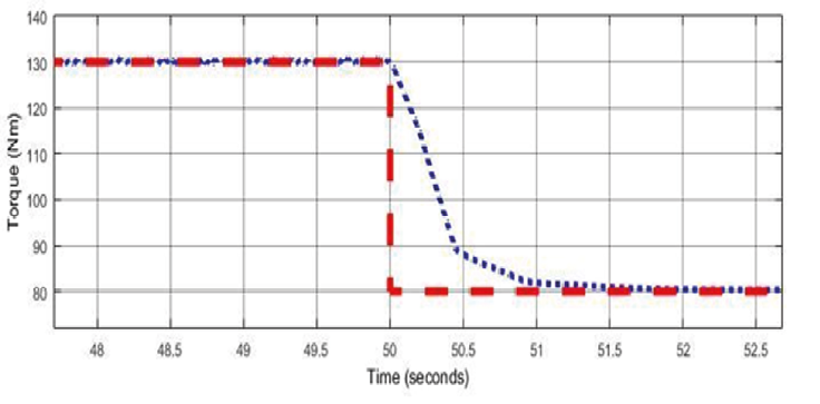 Torque reference (red signal) contrasting with torque signal (blue signal) in the simulink environment for 3000 RPM with negative step in the reference