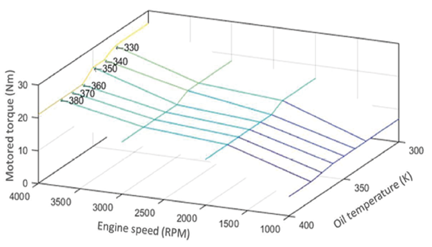 There are various methods to estimate torque losses due to friction. In this research, an active bench dynamometer capable of rotating the engine while it is off was used. The force necessary to rotate the engine can be regarded as the force required to overcome friction. Consequently, the torque measured by the active dynamometer in this scenario, known as motored torque, provides an approximation of the friction values 𝑇𝑓𝑟𝑖𝑐. Motored torque values were obtained at different oil temperatures and engine speeds, as shown in Figure 4.