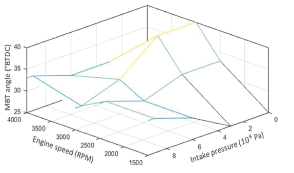 The relationship between the indicated torque and the ignition timing is parabolic (Moskwa, 1988). When the ignition angle 𝜉 is set to the maximum brake torque (MBT) angle 𝜉0, it is considered that there are no losses in efficiency due to the timing of ignition. The maximum brake torque angle is the angular position of the spark discharge that provides the highest indicated efficiency. The opening of the parabola is directly related to the coefficient 𝑘𝜉, as shown in equation (3). The factor that accounts for the efficiency losses due to the air-fuel ratio values can be approximated by equation (4) (Eriksson & Nielsen, 2014). The factor 𝑒𝛼 is mapped based on the engine speed and intake pressure.