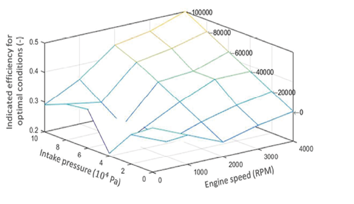 In order to construct the torque estimator, the optimal ignition angle and the optimal indicated efficiency were identified for various operating conditions. Figure 5 presents the results of the identification of the optimal ignition angle 𝜉0, while Figure 6 displays the results of the optimal indicated efficiency 𝑒𝛼.