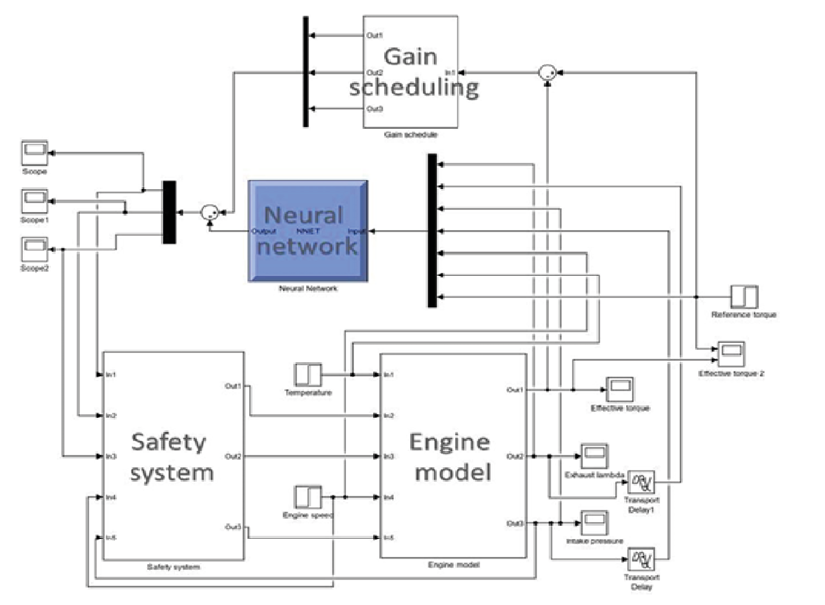 The neural network controller operates in parallel with a gain-schedule routine, which adjusts the controller’s gain increment by attenuating it when the error magnitude between the reference and effective torque is small. The developed controller is validated in a simulation with the modeled engine, as shown in Figure 1. The virtual engine is connected to a gain-scheduling routine, a neural network control system and a safety interface. The safety interface ensures that the control signals received by the actuators do not have values that could compromise the drivability and safety of the engine.