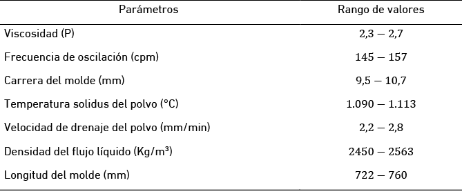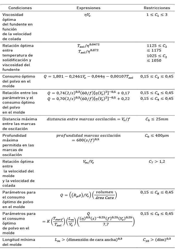 Conocer los modelos que involucran las variables del molde de colada continua es fundamental para determinar el ajuste en los parámetros del proceso. Kulkarni y Babu (2001) desarrollaron un sistema integrado que consta de metamodelos, que resultó ser útil, preciso y al mismo tiempo muy eficiente, ya que requería tratar pocas ecuaciones. Kulkarni y Babu (2003) desarrollaron un sistema integrado que consta de modelos de proceso; este sistema resultó ser importante para comprender y analizar el sistema de colada continua. Kulkarni y Babu (2005) presentaron una serie de características relacionadas con la calidad, así como algunas condiciones del proceso relacionadas con las características y parámetros relacionados con la condición de qué influyen en los defectos. Con base en estos estudios, en este trabajo se han identificado diez condiciones principales que relacionan los parámetros del molde, tal como se describen en la tabla 1. Es importante resaltar que las condiciones descritas en la tabla 1 deben cumplir con las restricciones, porque de no ser así, la probabilidad de aparición de defectos en el acero aumentará, razón por la que en este trabajo se busca satisfacer todas las restricciones.