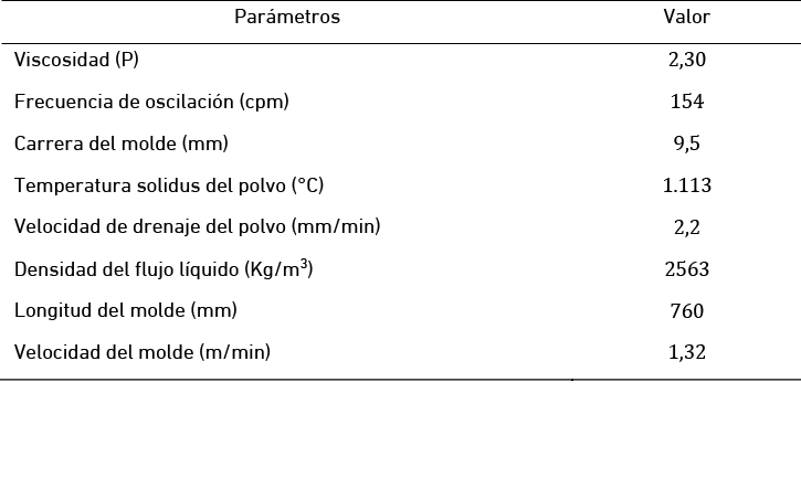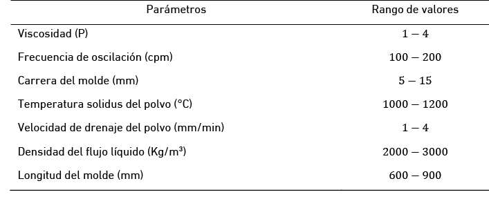 Nota: Donde, ŋes la viscosidad de equilibrio en poise, Vc es la velocidad de fundición en m/min., Tsol es la temperatura de solidificación del flujo del molde en °C, s es la longitud de carrera en mm, f la frecuencia en ciclos por minutos cpm, Vm es la velocidad del molde en m/min, Rp es la velocidad de drenaje en m/min, p es la densidad del flujo líquido de lubricante en kg/m3, Tsurf es la temperatura de la superficie de la costra en °C, Lm es la longitud del molde en m, K es una constante (K = 0,251), y la dimensión de la cara ancha en m.