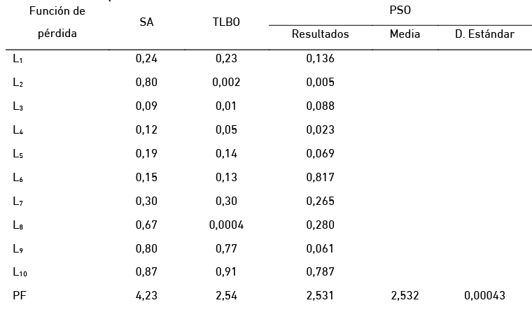 Se puede observar en la tabla 5 que los parámetros del molde que se han optimizado por PSO están dentro de los límites que previamente fueron ajustados según el reporte de la tabla 4; además, están dentro de los límites propuesto por (Kulkarni y Babu, 2001, 2003, 2005), manteniendo las restricciones de la tabla 3. Respecto a las funciones de pérdida individual de la tabla 6, se observa una mejora considerable en todos los resultados del PSO respecto a los publicados por Venkata et al. (2014), sobre un proceso de optimización por recocido simulado (SA), excepto en la función L6. Y al comparar los resultados del PSO respecto al TLBO (Venkata et al., 2014) hubo una mejora en seis de las diez condiciones. En las funciones individuales donde hubo mejoras, en general la indeseabilidad se aproximó a cero, sin embargo la mejoría en L7 y L10 no fue tan importante. Este comportamiento en los resultados obedece a que en las funciones de pérdida existen parámetros comunes y se debe cumplir con las restricciones descritas en las tablas 1 y 3, simultáneamente.