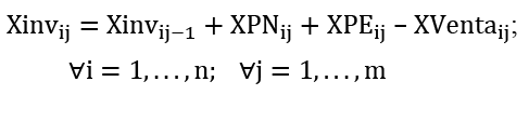 Xinvij: número en unidades en inventario final de las prendas modelo i = 1,…,n durante el mes j = 1,…,m.