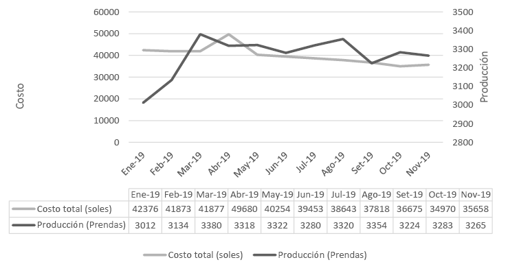 Figura 4. Gráfica de la producción y los costos desde enero hasta noviembre del 2019 en la mype de confección de camisas para caballeros