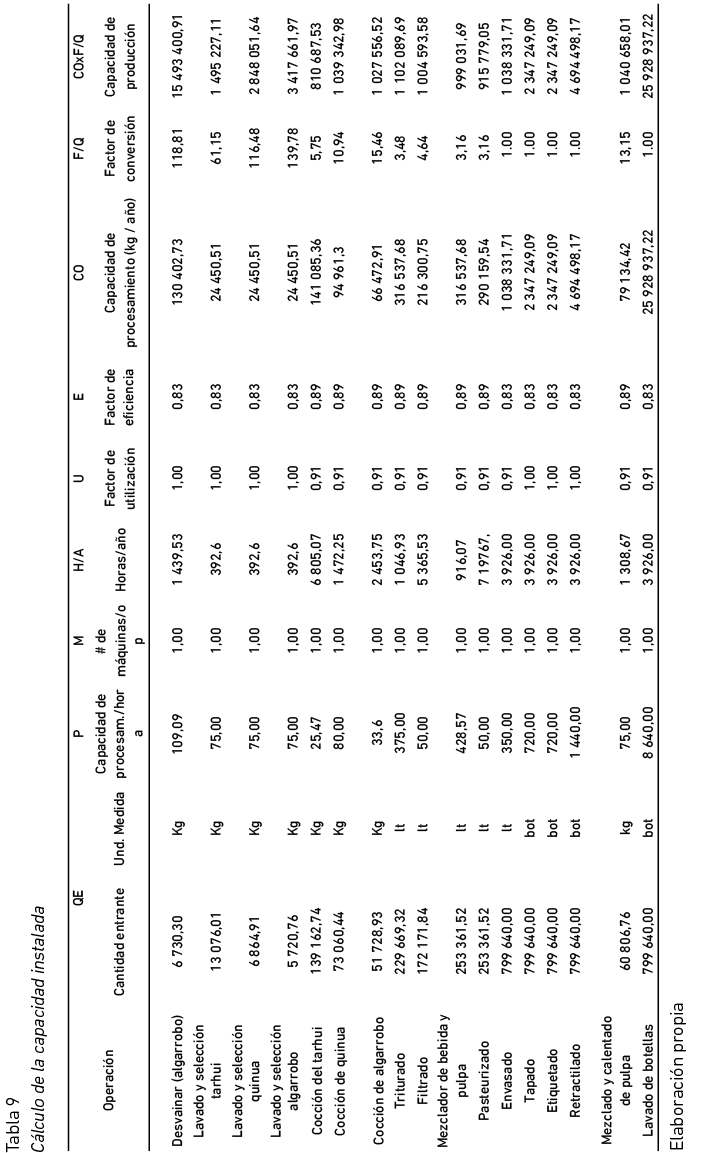 En la tabla 9, se muestra los cálculos para hallar la capacidad instalada que es delimitada por la operación cuello de botella, en este caso, la cocción del tarwi.