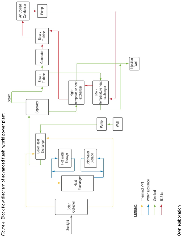 The model for the process that allowed us to make the simulation was built starting with supercritical steam and R-134a refrigerant as the binary fluid. A flash tank, steam cycle, and solar cycle were added as well. Regarding the parameters used, the design was based on a supercritical binary cycle of R134a, due to its cooling performance and lower input energy required than other binary fluids and supercritical cycles (Meyer, 2001). The cycle was restricted to the following parameters: