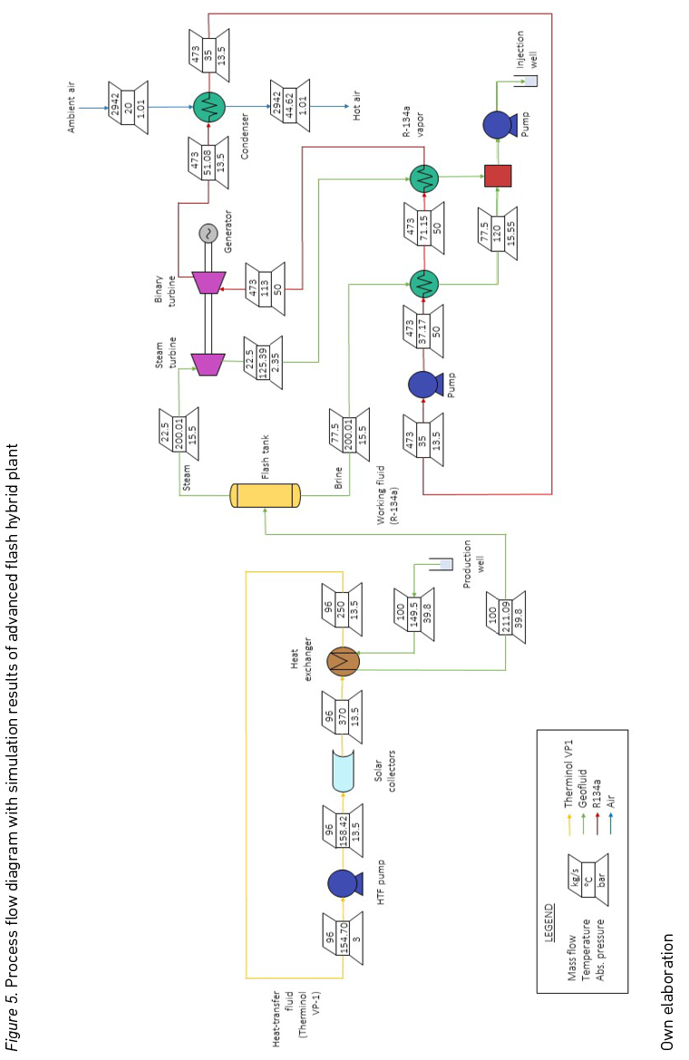 The first results were obtained in a flash tank, which separates the steam from the hot brine. The steam comes out from the top of the flash tank with a flowrate of 22,5 kg/s, a temperature of 200 °C, and a pressure of 15,5 bar. On the other hand, the stream of hot brine comes out from the bottom of the flash tank with a mass flow of 77,5 kg/s at the same temperature and pressure as the steam (200 °C, 15.5 bar). As both fluids continue the process, the steam enters the steam turbine, coming out at 125,4 °C, and 2,35 bar, generating 4,89 MW of power. Meanwhile, the brine goes into the first condenser and acts as the heating fluid against the working fluid (R-134a). This allows the latter to increase its temperature from 37,2 °C to 71,2 °C, keeping a mass flowrate of 473 kg/s. The second condenser works with the steam coming from the steam turbine as the heating fluid against the working fluid, allowing it to increase its temperature once again, this time from 71,2 °C to 113 °C and keeping its mass flow and pressure at 473 kg/s and 50 bar, respectively.