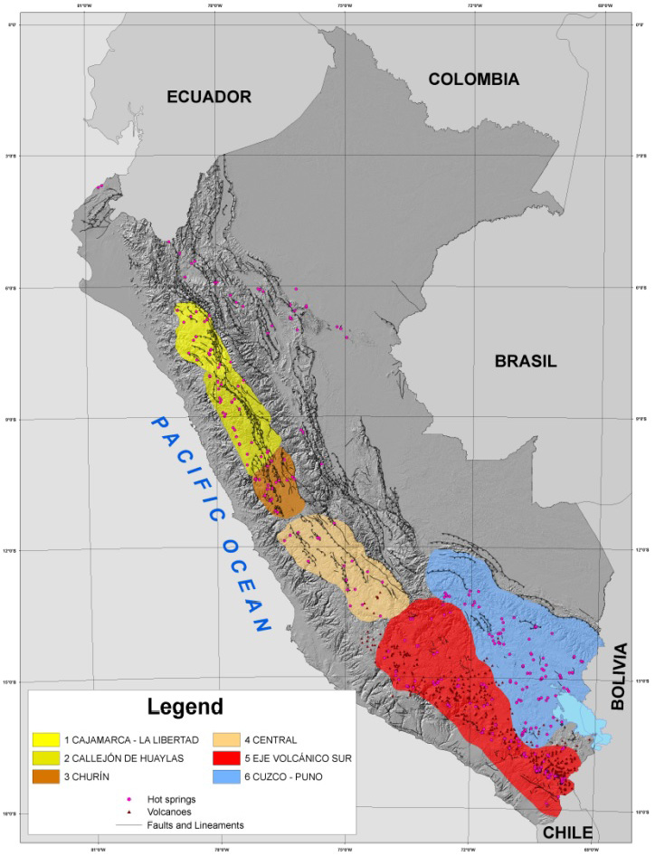 • According to the Ministry of Energy and Mines, Peru ranks first in South America for its level of exploration due to the availability of geothermal resources. The country could generate up to 2860 MW in 61 geothermal fields based on the distribution of hot springs and other hydrothermal manifestations located mainly in Arequipa, Moquegua, Tacna, and Puno. (Ministerio de Energía y Minas, 2011).